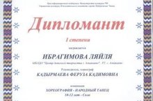 Солистка хореографического коллектива "Мирас" Ибрагимова Ляйля стала дипломантом 1 степени I Международного детского конкурса – фестиваля «Когда мы вместе», который проходил с 9-12 декабря в г. Набережные Челны 01.01.2018