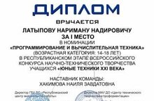 Латыпов Нариман Надирович дипломант за 1 место в номинации "Программирование и вычислительная техника" в республиканском этапе Всероссийского конкурса научно-технического творчества учащихся "Юные техники 21 века". 03.05.2023