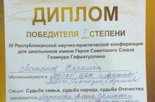 24.03.2023г. на IV Республиканской научно-практической конференции имени Героя Советского Союза Газинура Гафиатуллина в г.Бугульма Латыпов Нариман выступил с исследовательской работой на тему "Память о прадедушке жива" и занял 1 место (педагоги (Латыпова А.С., Гараева Л.А.) 25.03.2023