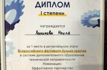 10.06.2022 педагог технической направленности Хакимова Наиля Завдатовна завоевала 1 место на региональном этапе Всероссийского фестиваля лучших практик в системе дополнительного образования 21.06.2022