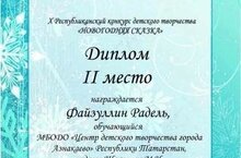 Учащийся объединения "Палитра" Файзуллин Радель занял 2 место на Республиканском конкурсе детского творчества "Новогодныы сказка" (педагог Шакирова М.И.) 08.02.2024