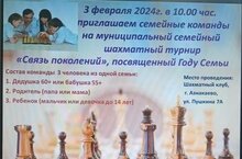 03.02.2024г. в шахматный клуб, который находится по адресу: ул. Пушкина 7а, приглашаем семейные команды на муниципальный семейный шахматный турнир, посвященный Году Семьи 29.01.2024
