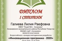 Поздравляем педагога дополнительного образования Галиеву Л.Р. с победой на Всероссийском конкурсе методических разработок "Инновационная программа - 2020" (диплом 1 степени) 15.05.2020