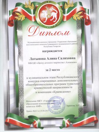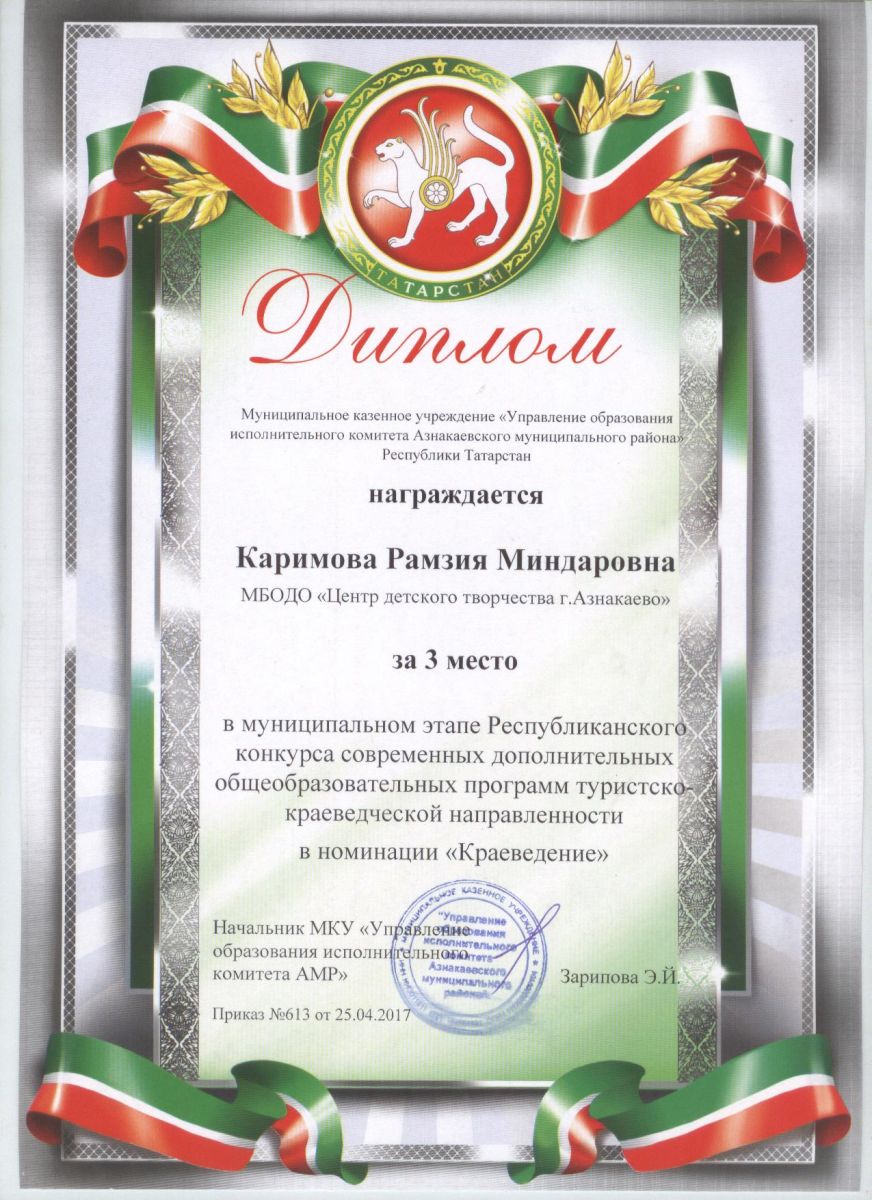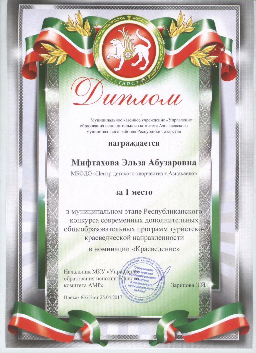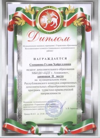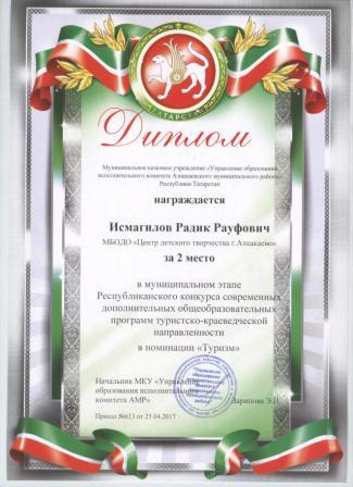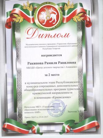 2 место в муниципальном конкурсе «Музей в чемодане» (Мифтахова Э.А.)3 место в муниципальном этапе Республиканского конкурса современных дополнительных общеобразовательных программ (Марданшин А.И.)