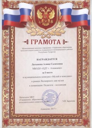 1 место в муниципальном конкурсе «Музей в чемодане» (Латыпова А.С.)