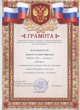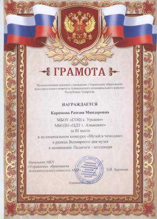 2 место в муниципальном конкурсе «Музей в чемодане» (Зарипова З.Р.)
