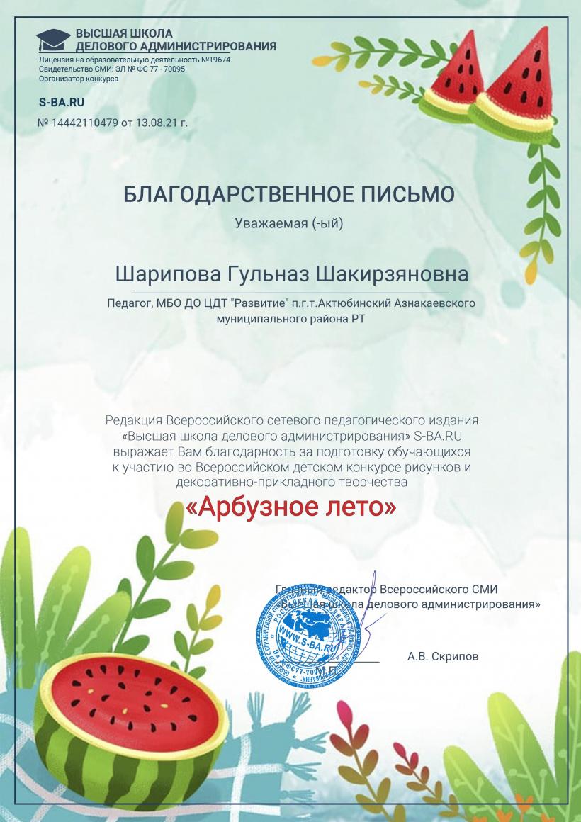 Благодарственное письмо за подготовку обучающихся в конкурсе "Арбузное лето", педагог Шарипова Г.Ш.