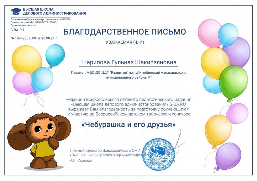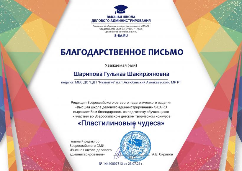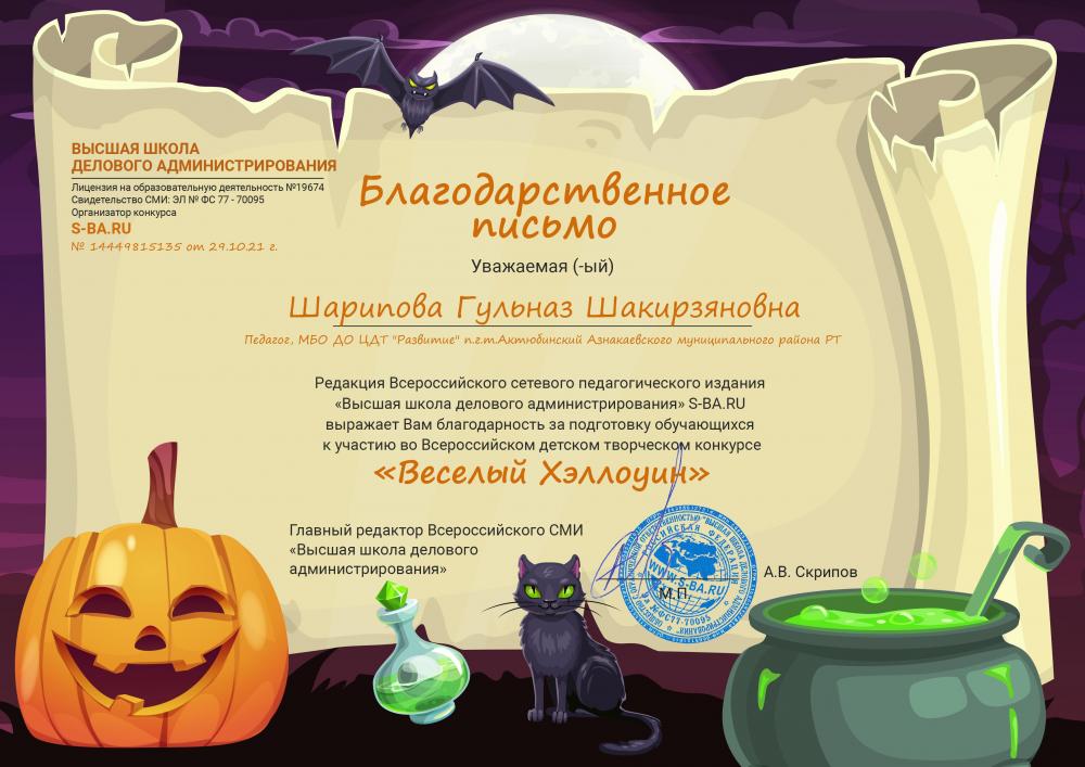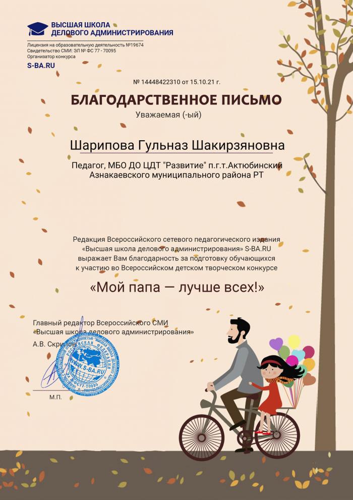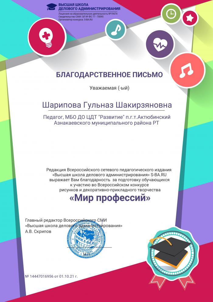 Благодарственное письмо за подготовку обучающихся в конкурсе "Мир профессий", педагог Шарипова Г.Ш.