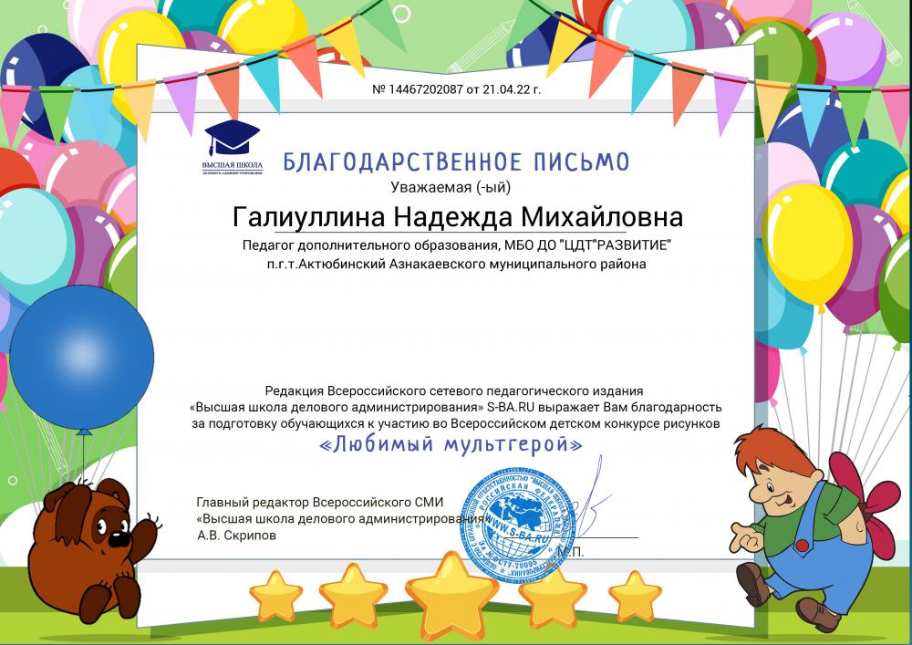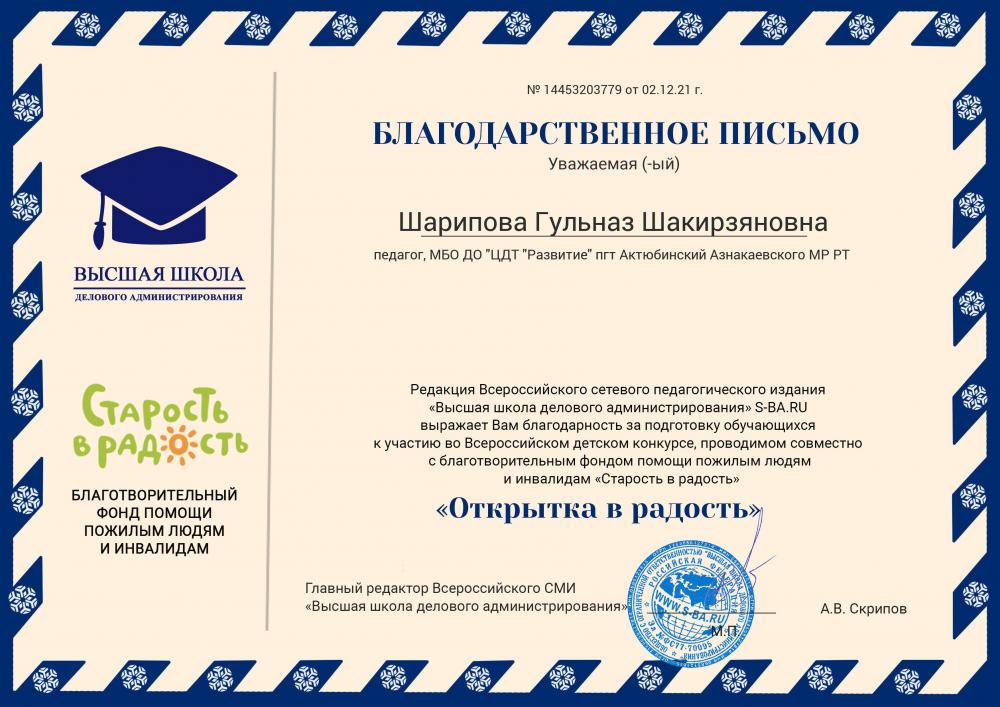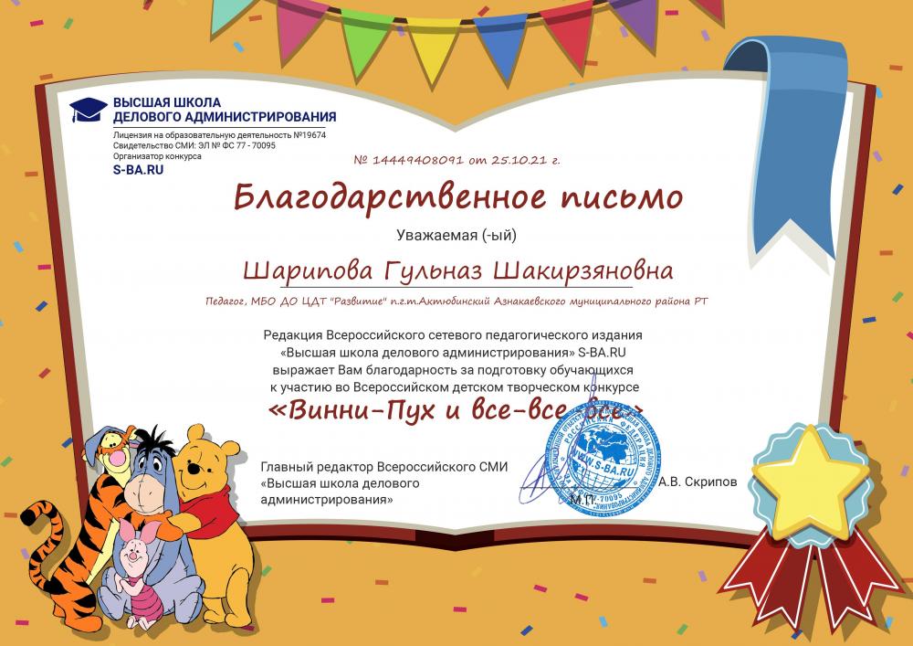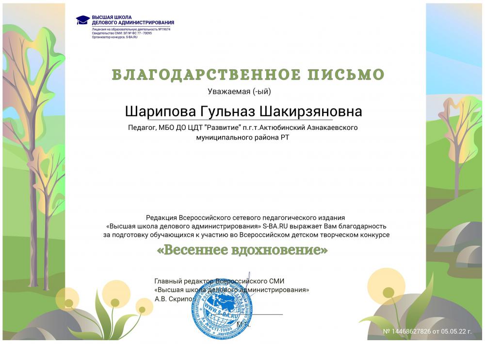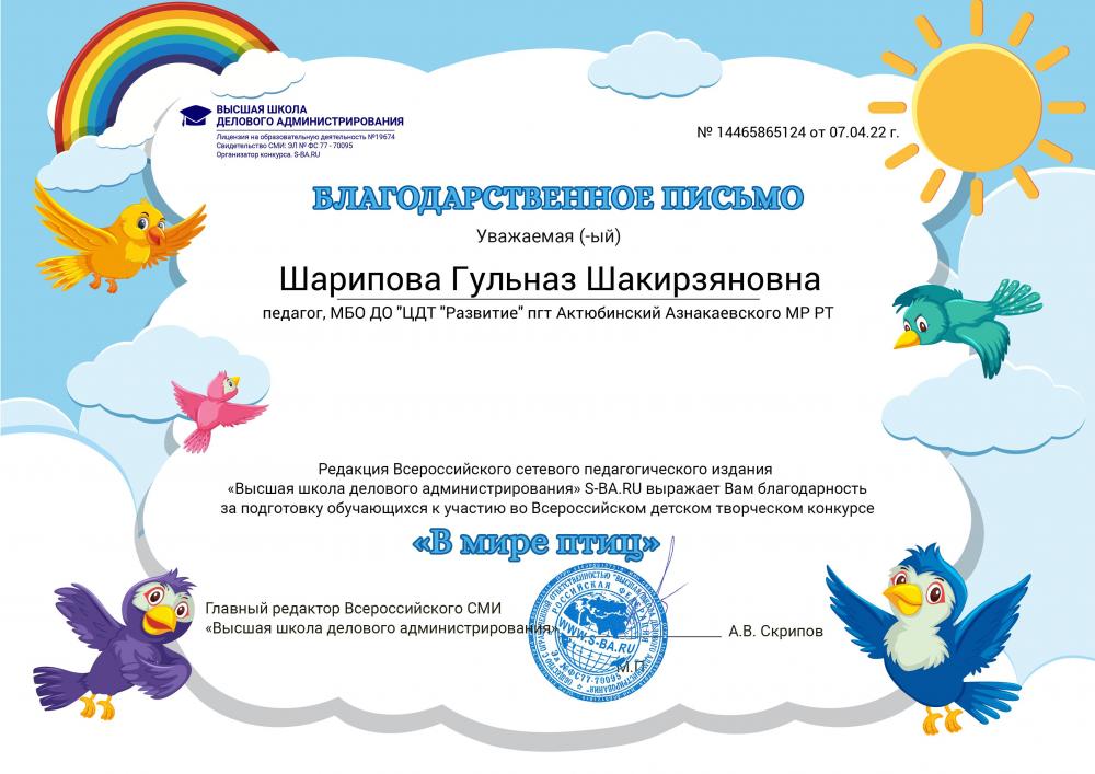 Благодарственное письмо за подготовку обучающихся в конкурсе "В мире птиц", педагог Шарипова Г.Ш.