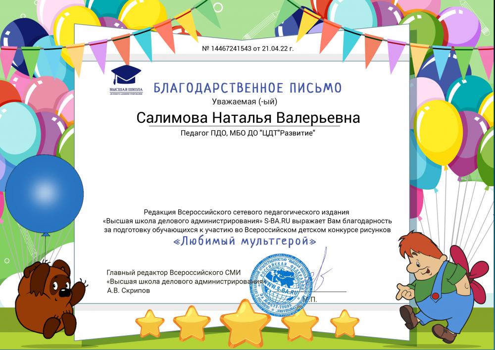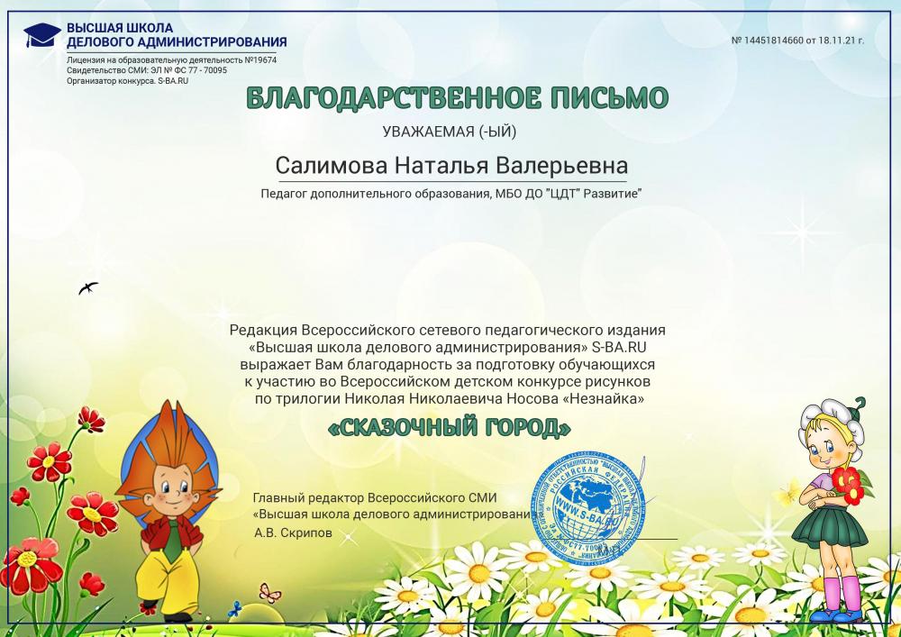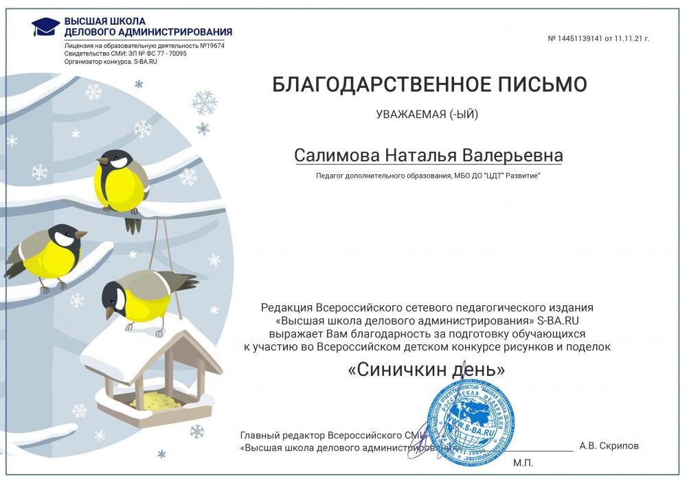 Благодарственное письмо за подготовку обучающихся в конкурсе "Синичкин день", педагог Салимова Н.В.