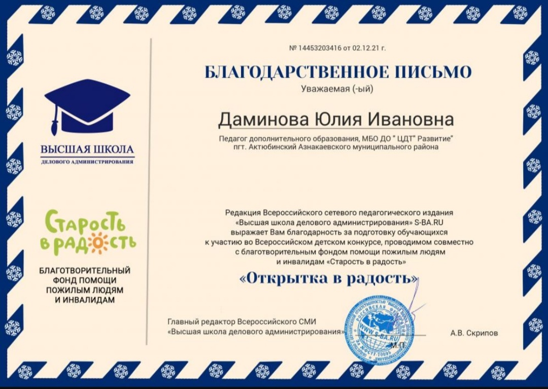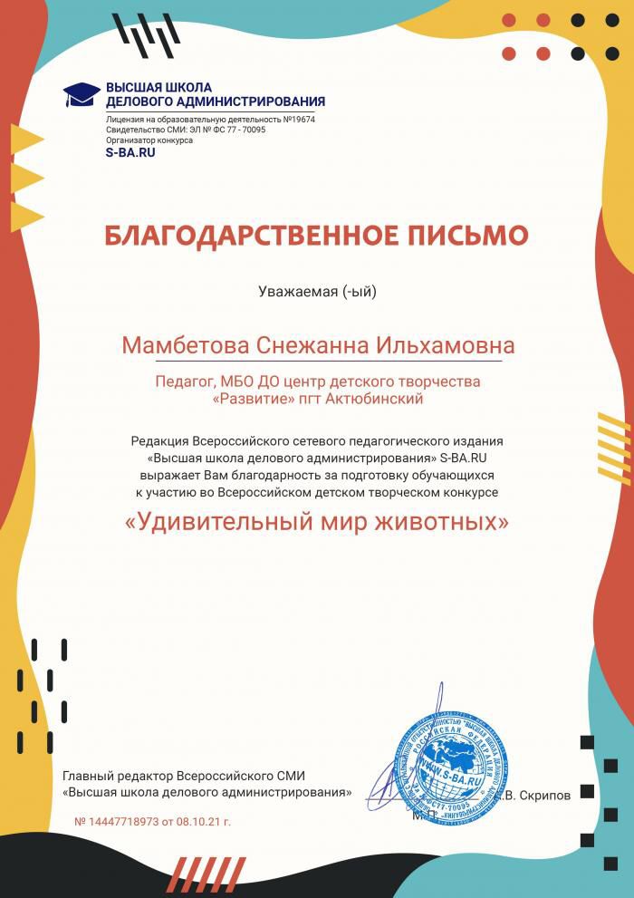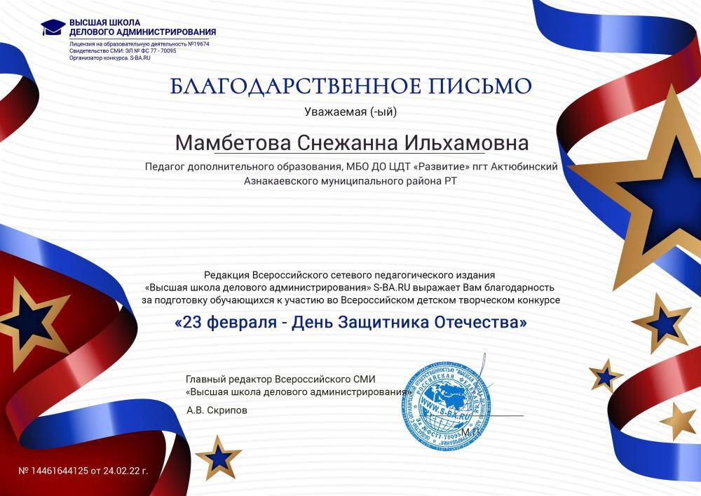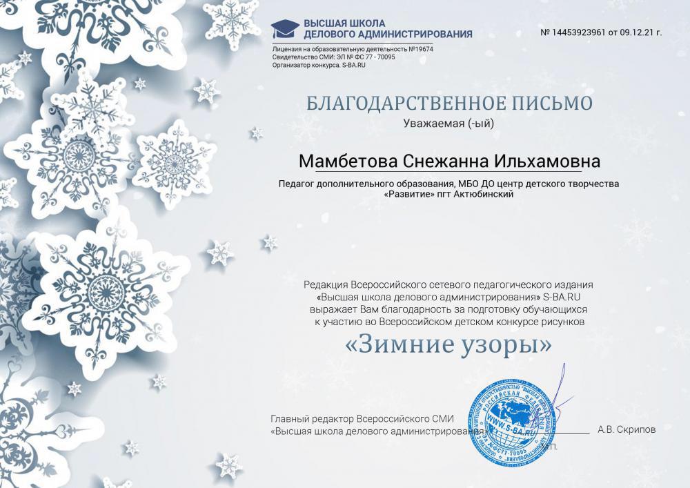 Благодарственное письмо за подготовку обучающихся в конкурсе "Зимние узоры", педагог Мамбетова С.И.