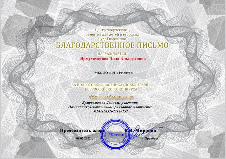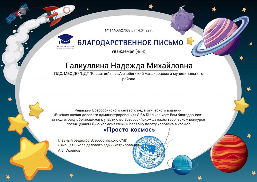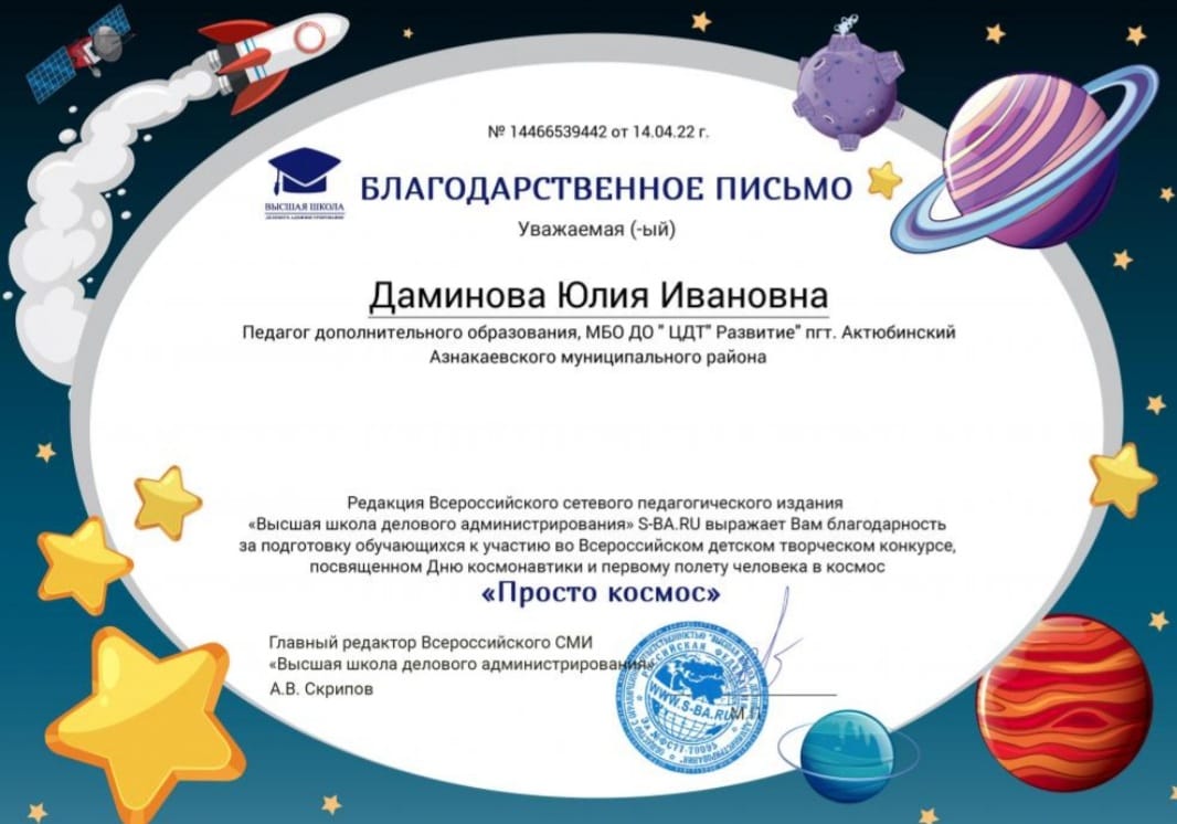 Благодарственное письмо за подготовку обучающихся к конкурсу "Просто космос", педагог Даминова Ю.И.