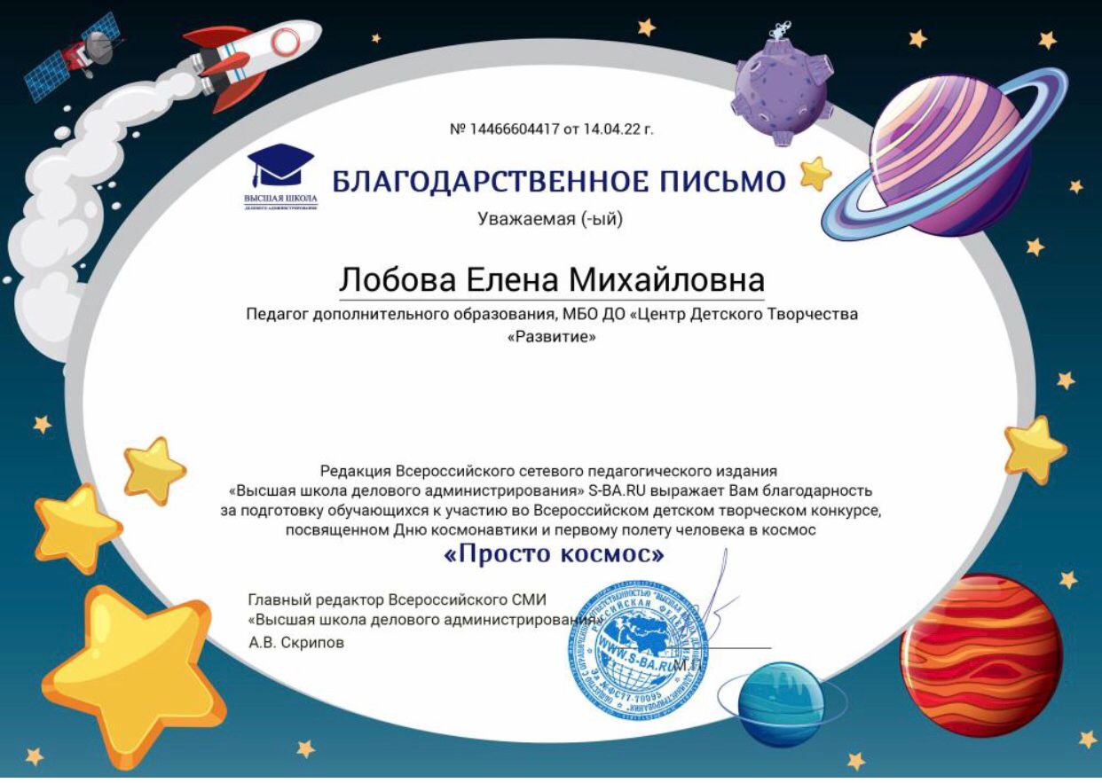 Благодарственное письмо за подготовку обучающихся к конкурсу "Просто космос", педагог Лобова Е.М.
