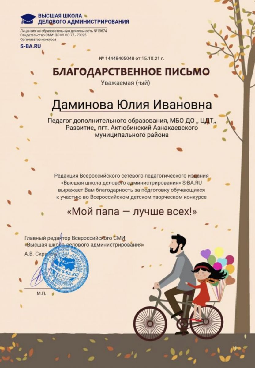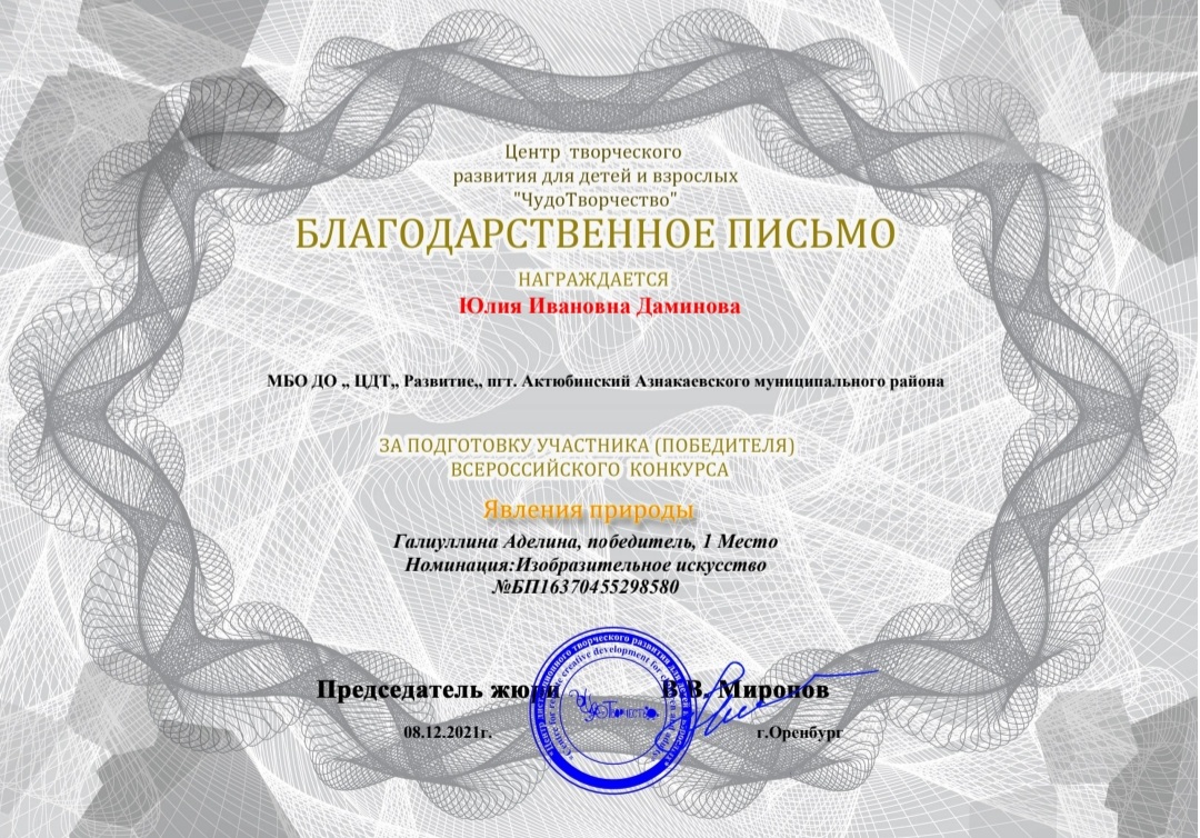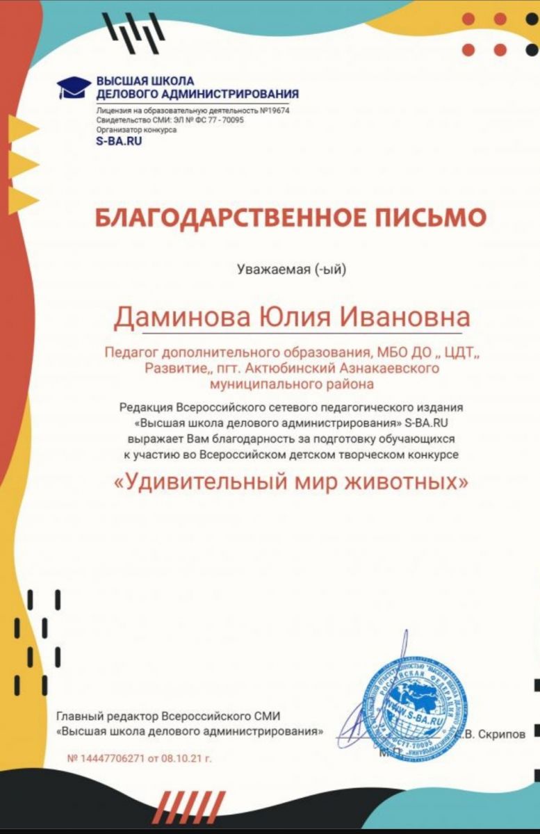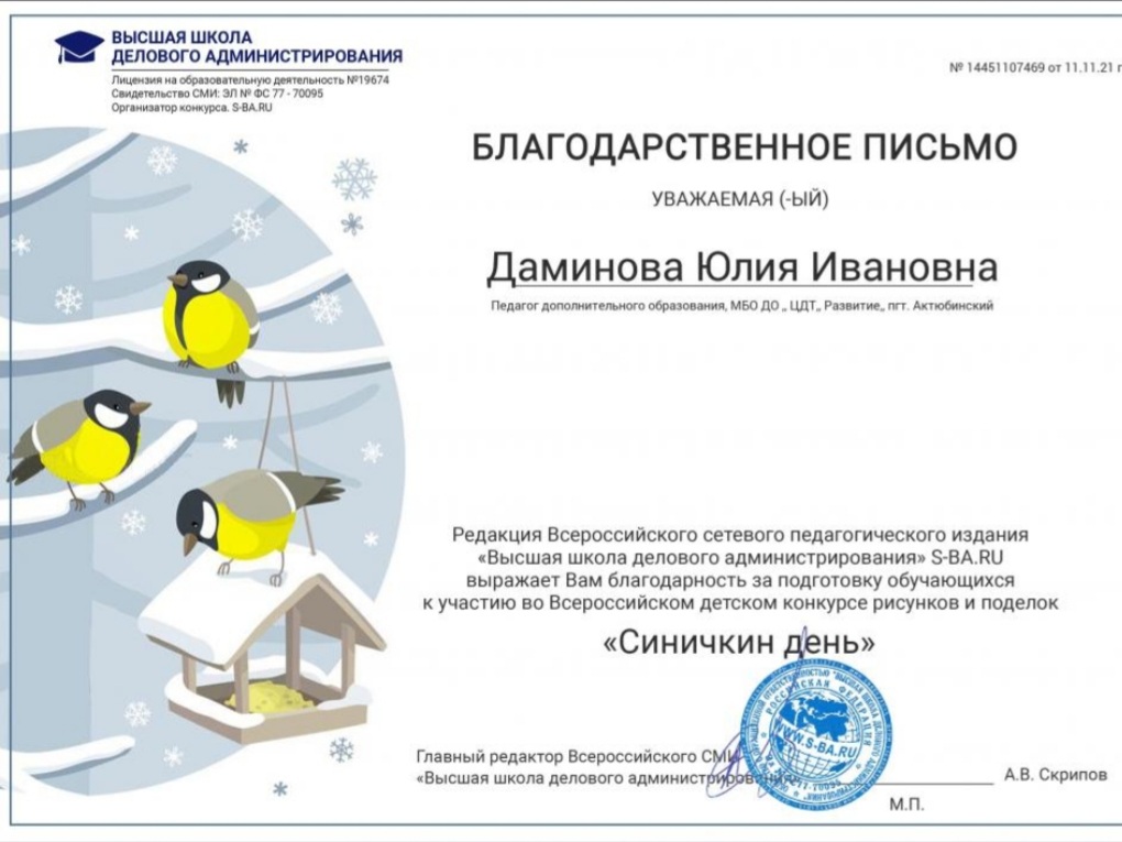 Благодарственное письмо за подготовку обучающихся в конкурсе "Синичкин день", педагог Даминова Ю.И.