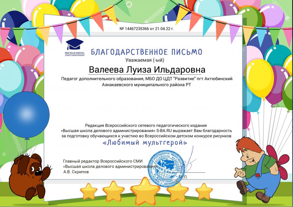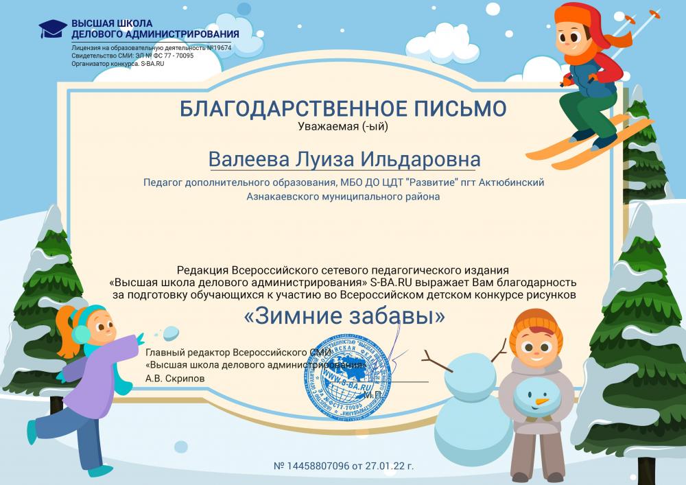 Благодарственное письмо за подготовку обучающихся в конкурсе "Зимние забавы", педагог Валеева Л.И.
