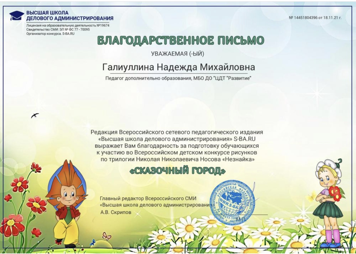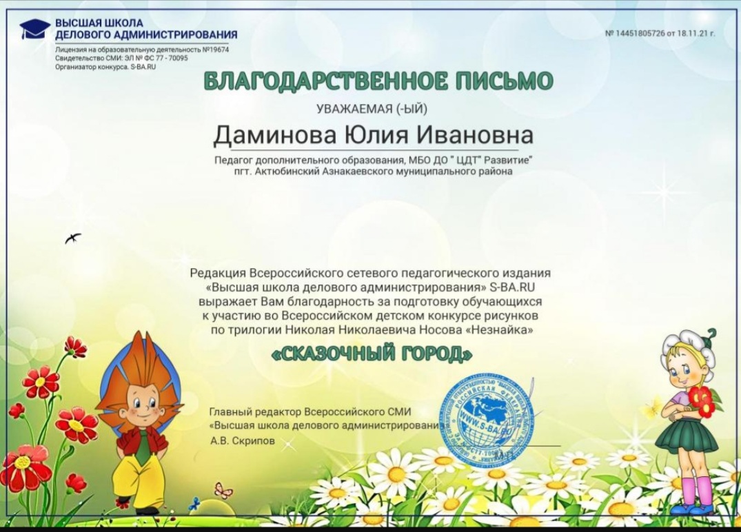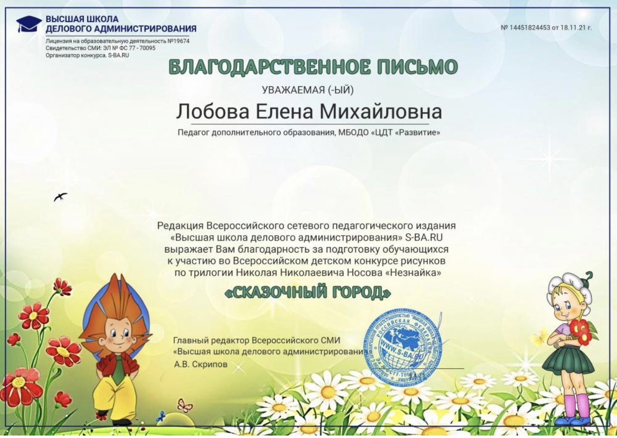 Благодарственное письмо за подготовку обучающихся в конкурсе "Сказочный город", педагог Лобова Е.М.
