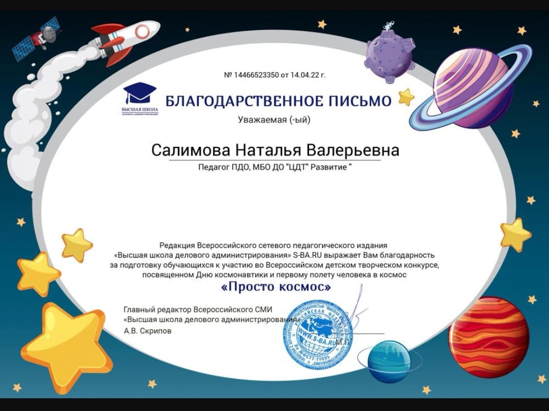 Благодарственное письмо за подготовку обучающихся к конкурсу "Просто космос", педагог Салимова Н.В.