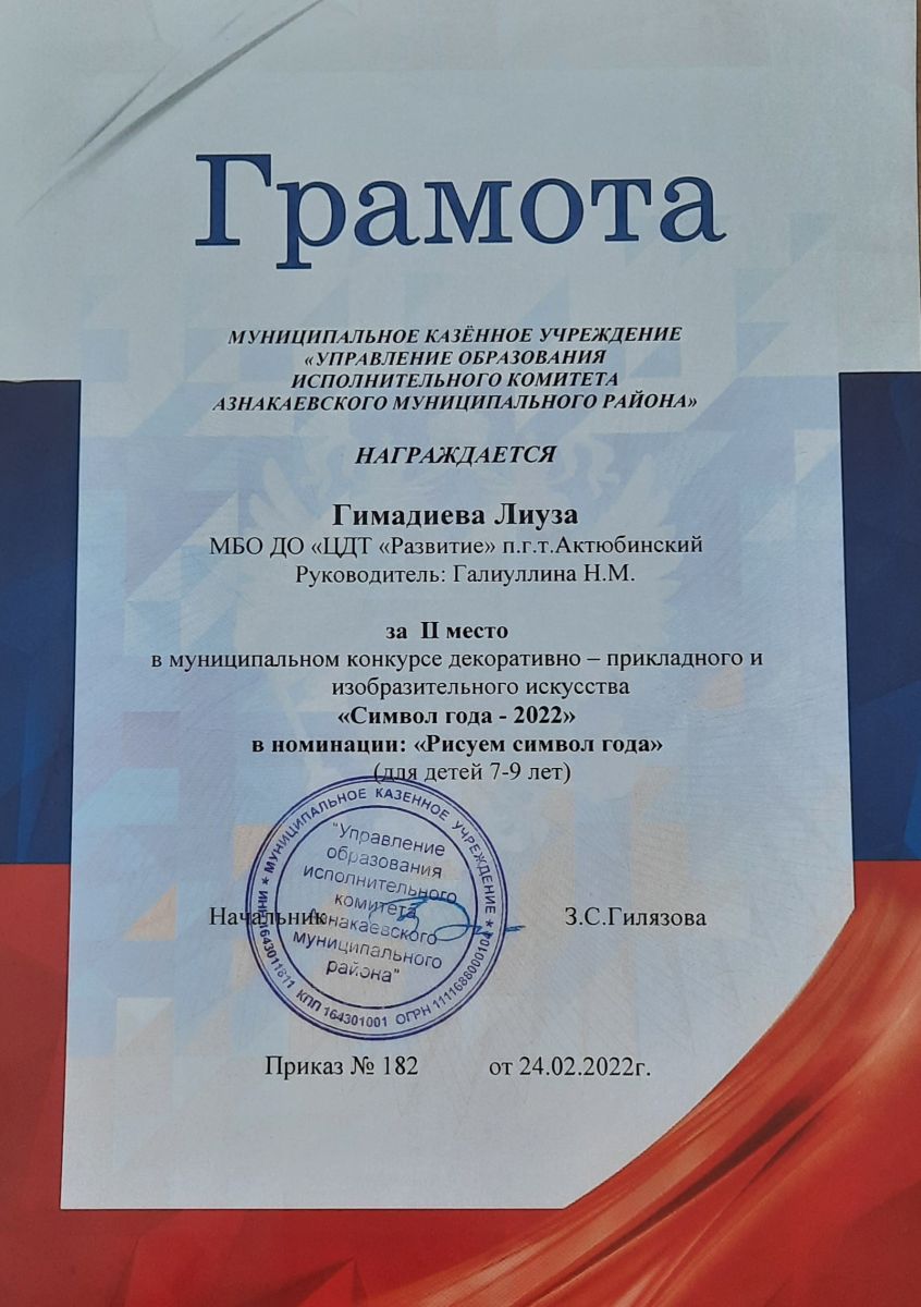 Грамота за 2 место в конкурсе "Символ года - 2022", участница Гимадиева Л., педагог Галиуллина Н.М.