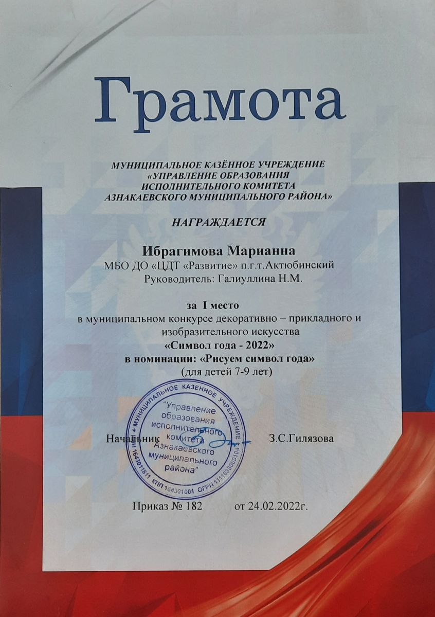 Грамота за 1 место в конкурсе "Символ года - 2022", участница Ибрагимова М., педагог Галиуллина Н.М.