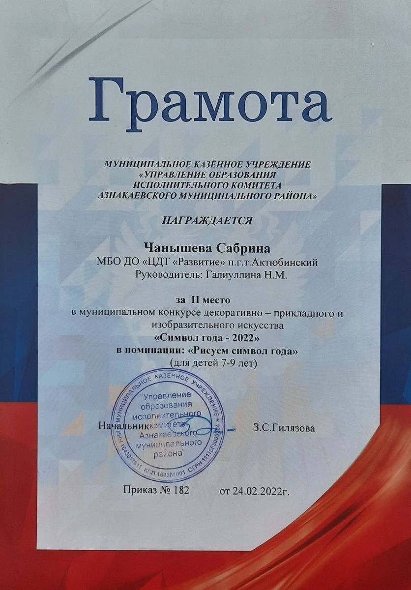 Грамота за 2 место в конкурсе "Символ года - 2022", участница Чанышева С., педагог Галиуллина Н.М.