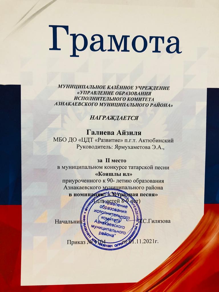 Диплом за 2 место в конкурсе "Кояшлы ил", участница Галиева А., педагог Ярмухаметова Э.А.