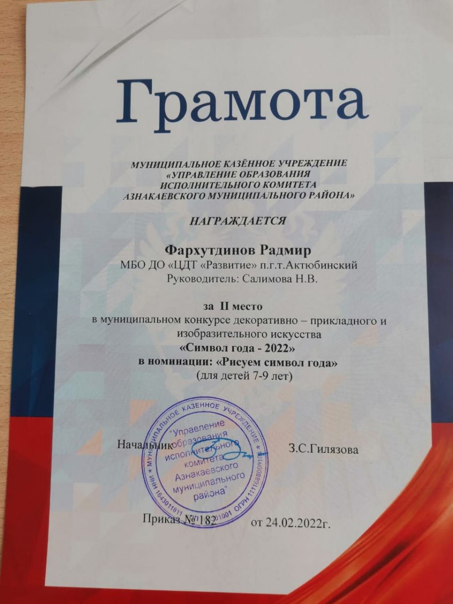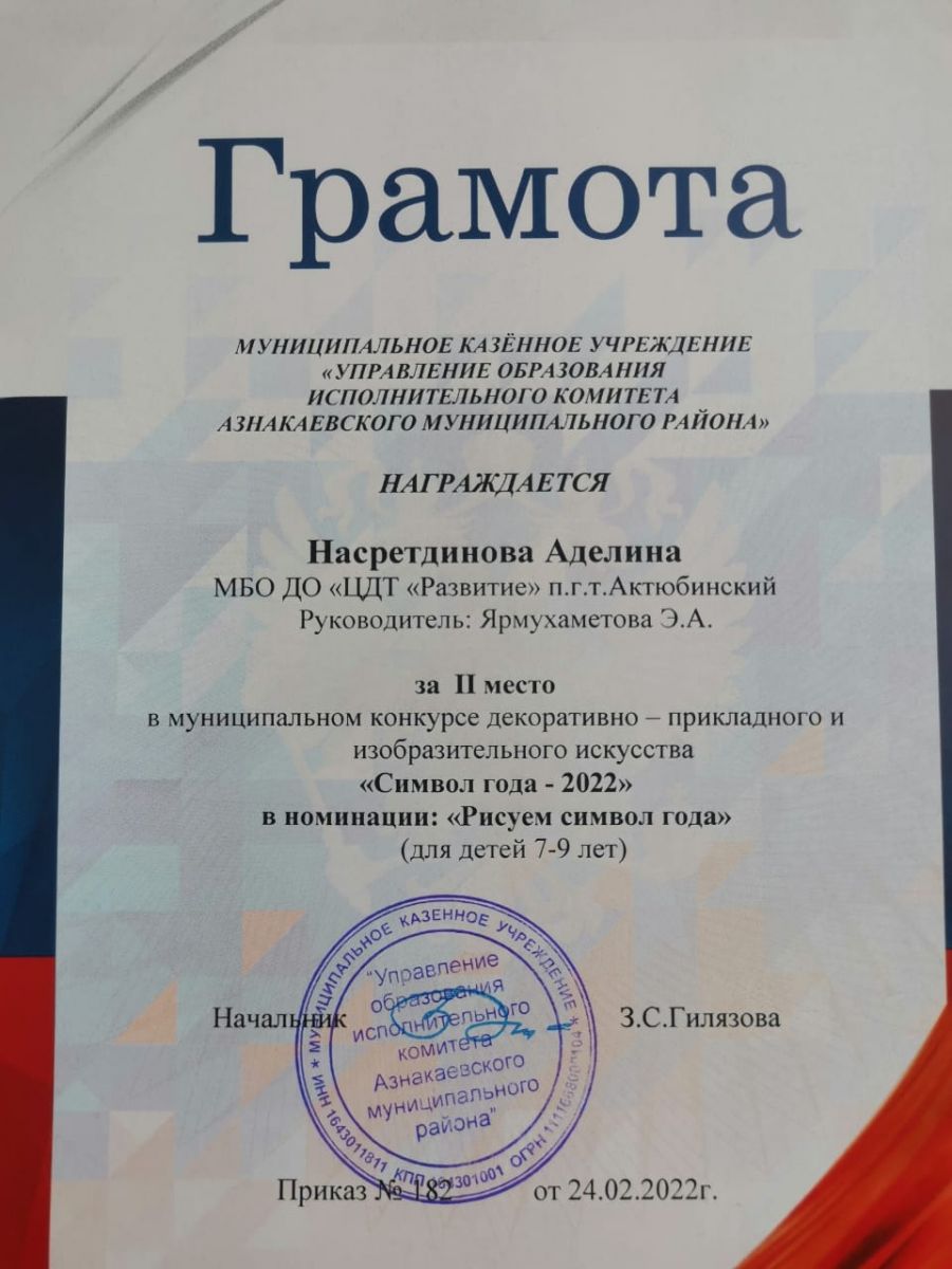 Грамота за 2 место в конкурсе "Символ года - 2022", участница Насретдинова А., педагог Ярмухаметова Э.А.