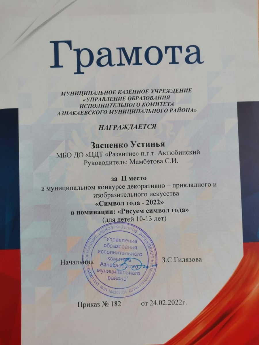Грамота за 2 место в конкурсе "Символ года - 2022", участница Заспенко У., педагог Мамбетова С.И.