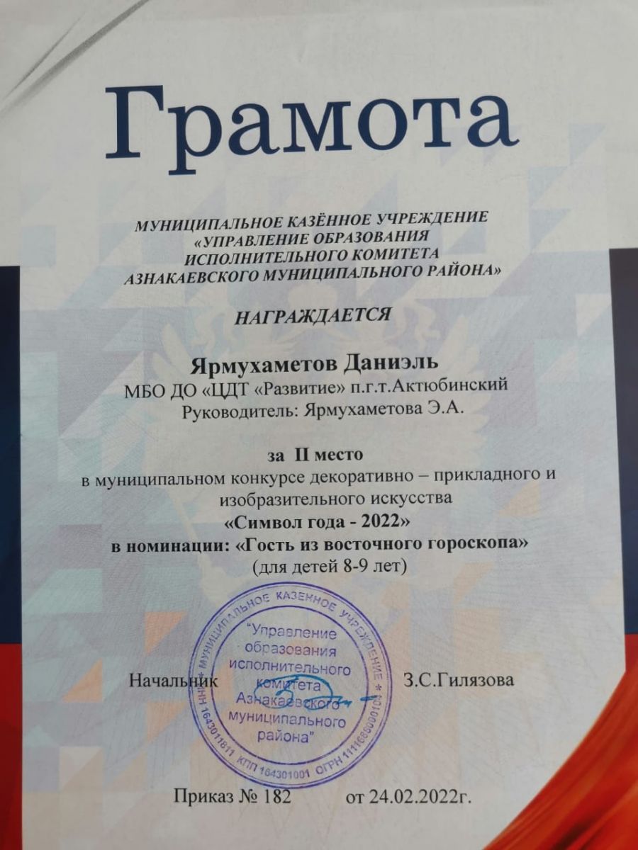 Грамота за 2 место в конкурсе "Символ года - 2022", участник Ярмухаметов Д., педагог Ярмухаметова Э.А.