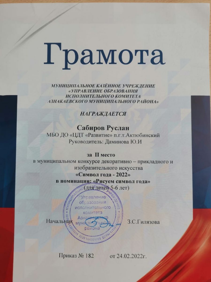 Грамота за 2 место в конкурсе "Символ года - 2022", участник Сабиров Р., педагог Даминова Ю.И.