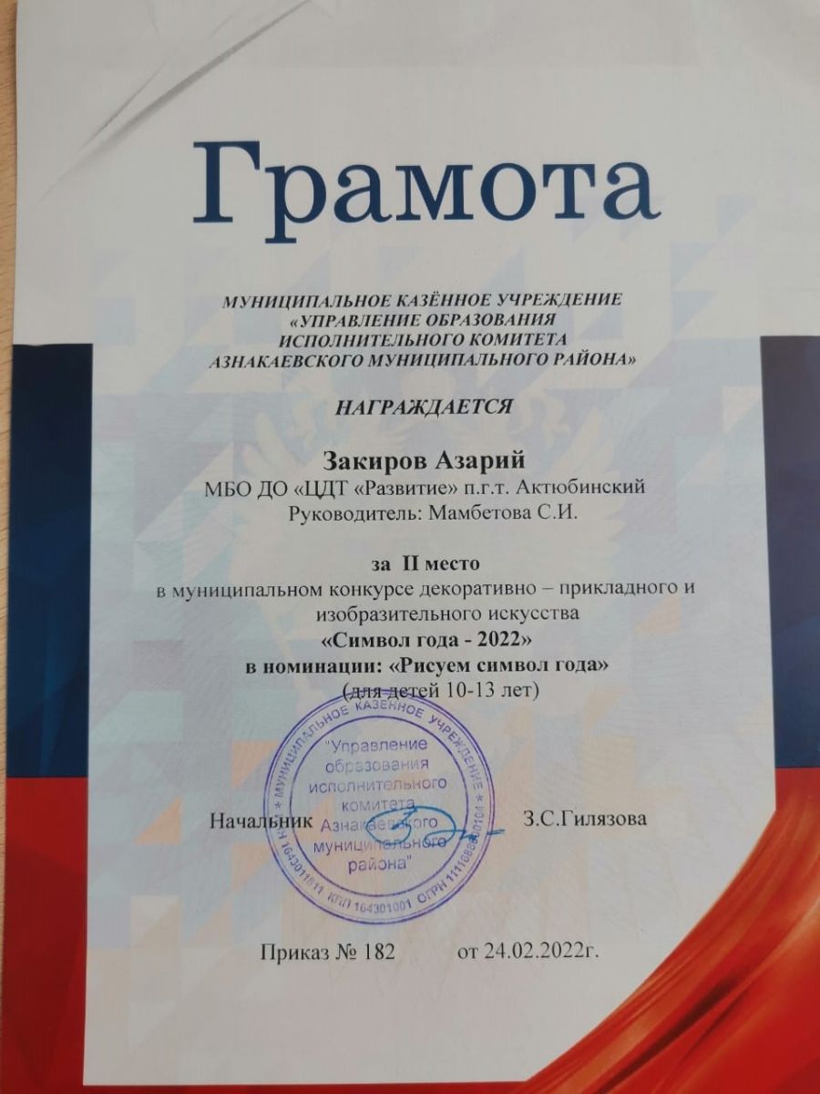Грамота за 2 место в конкурсе "Символ года - 2022", участник Закиров А., педагог Мамбетова С.И.
