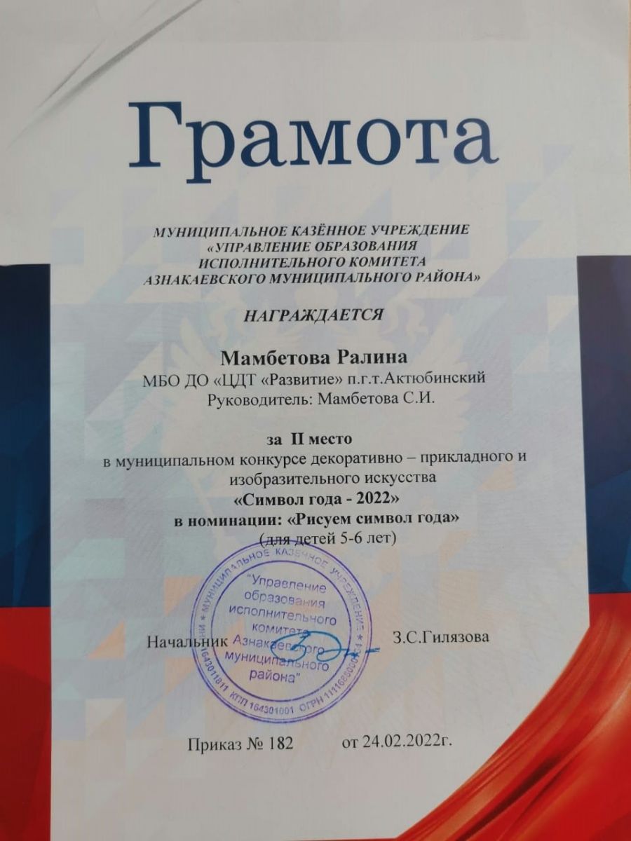 Грамота за 2 место в конкурсе "Символ года - 2022", участница Мамбетова Р., педагог Мамбетова С.И.