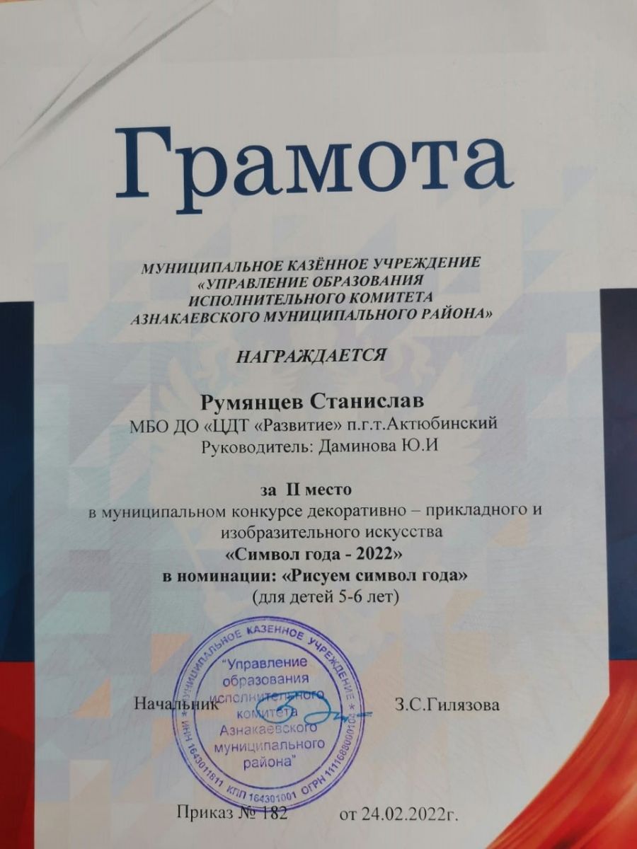 Грамота за 2 место в конкурсе "Символ года - 2022", участник Румянцев С., педагог Даминова Ю.И.