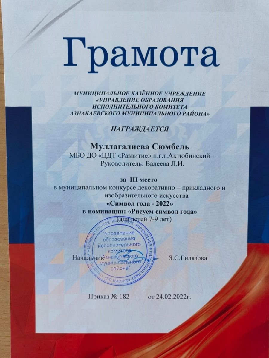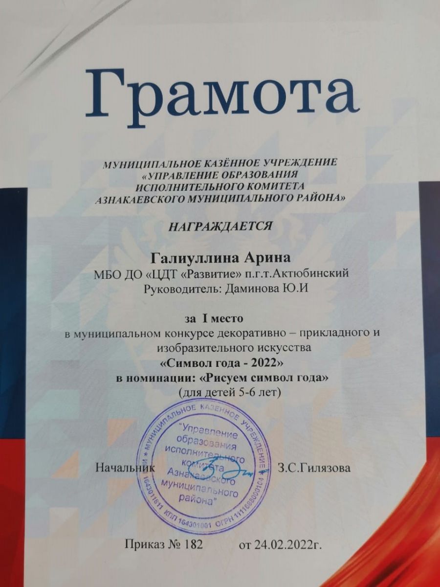 Грамота за 1 место в конкурсе "Символ года - 2022", участница Галиуллина А., педагог Даминова Ю.И.