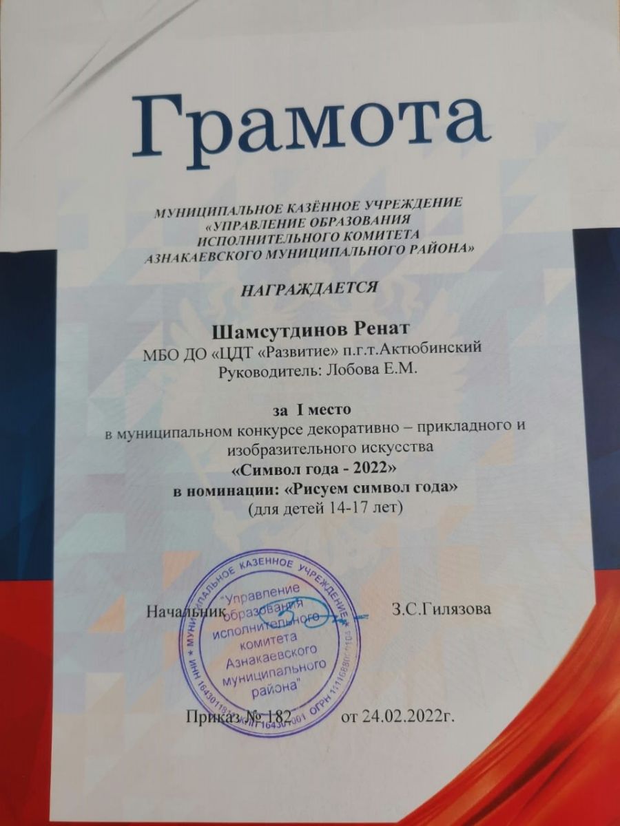 Грамота за 1 место в конкурсе "Символ года - 2022", участник Шамсутдинов Р., педагог Даминова Ю.И.