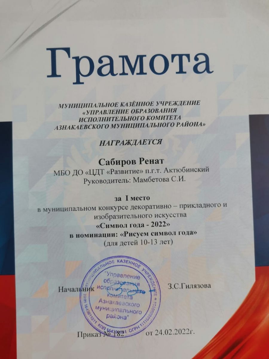 Грамота за 1 место в конкурсе "Символ года - 2022", участник Сабиров Р., педагог Мамбетова С.И.