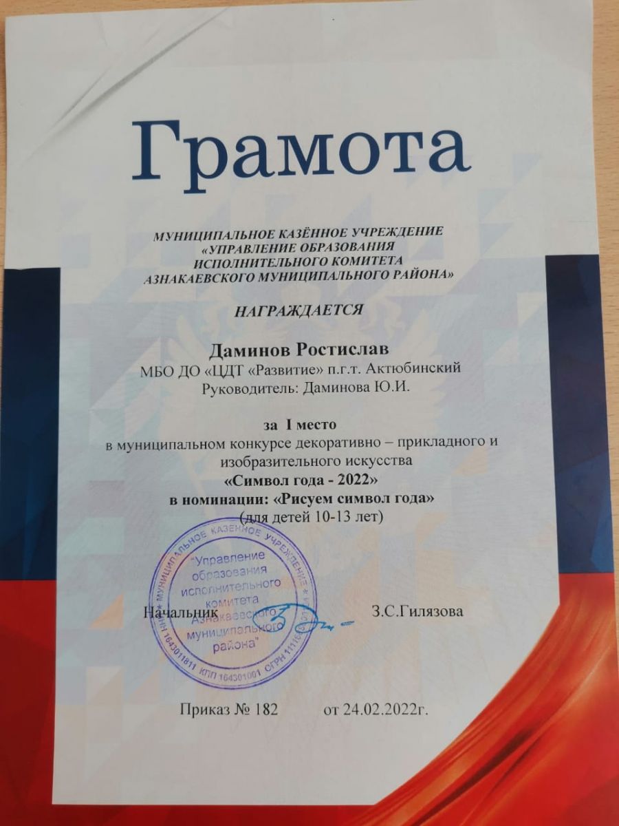 Грамота за 1 место в конкурсе "Символ года - 2022", участник Даминов Р., педагог Даминова Ю.И.