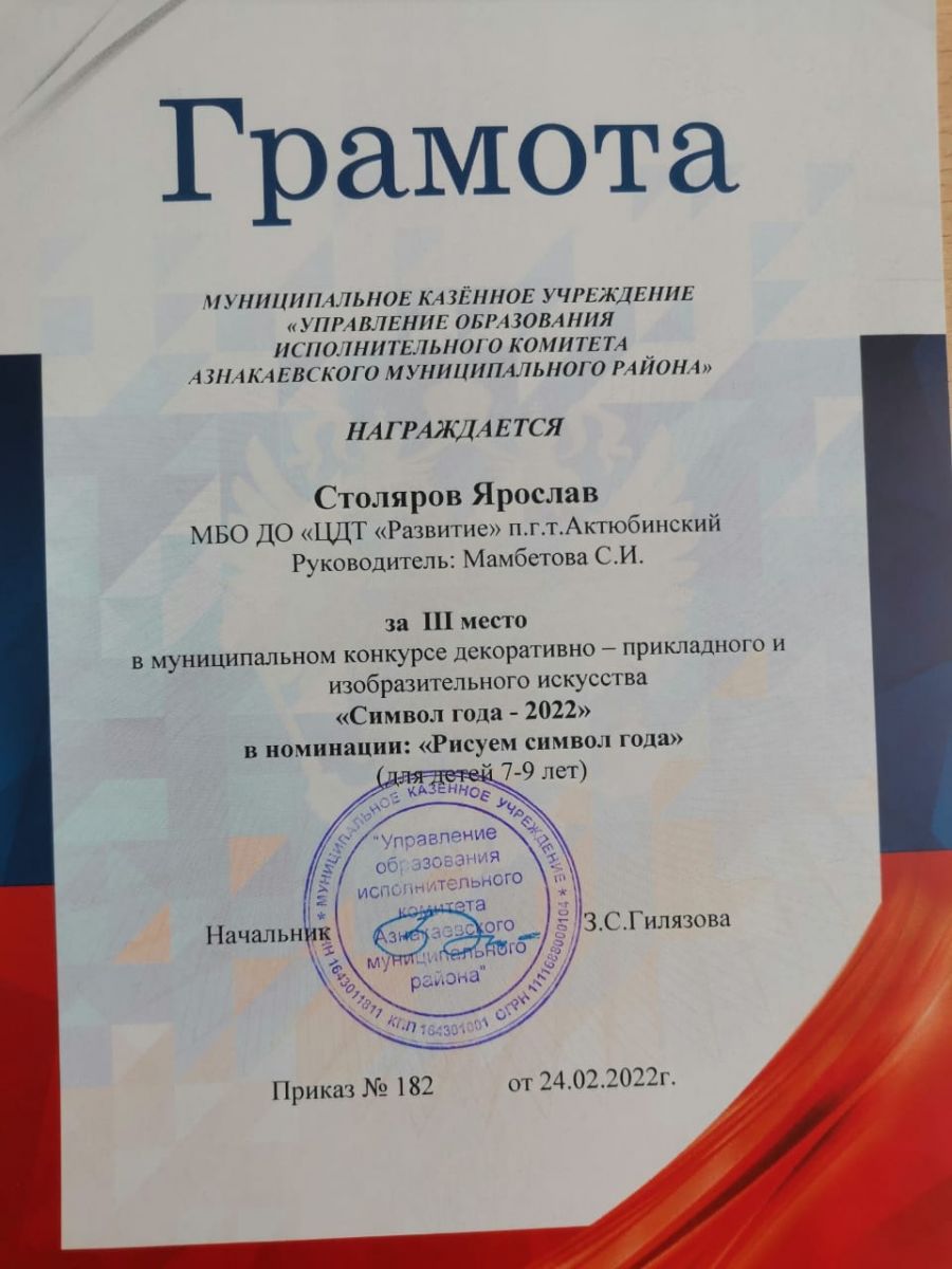 Грамота за 3 место в конкурсе "Символ года - 2022", участник Столяров Я., педагог Мамбетова С.И.