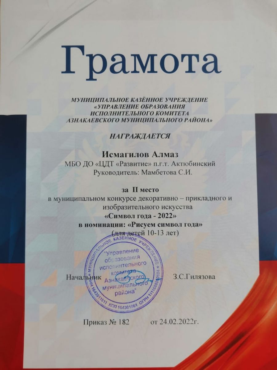 Грамота за 2 место в конкурсе "Символ года - 2022", участник Исмагилов А., педагог Мамбетова С.И.