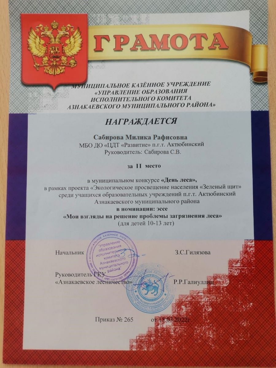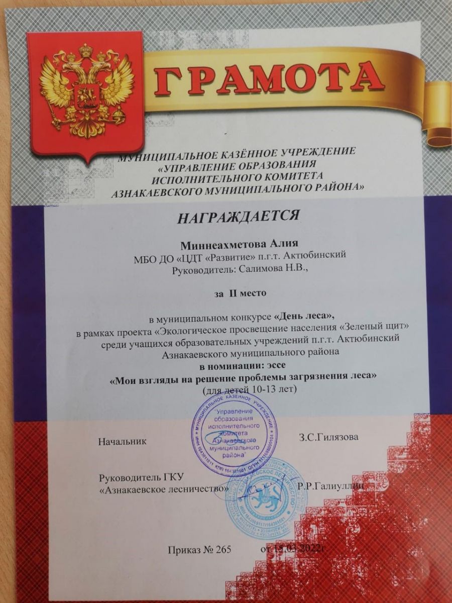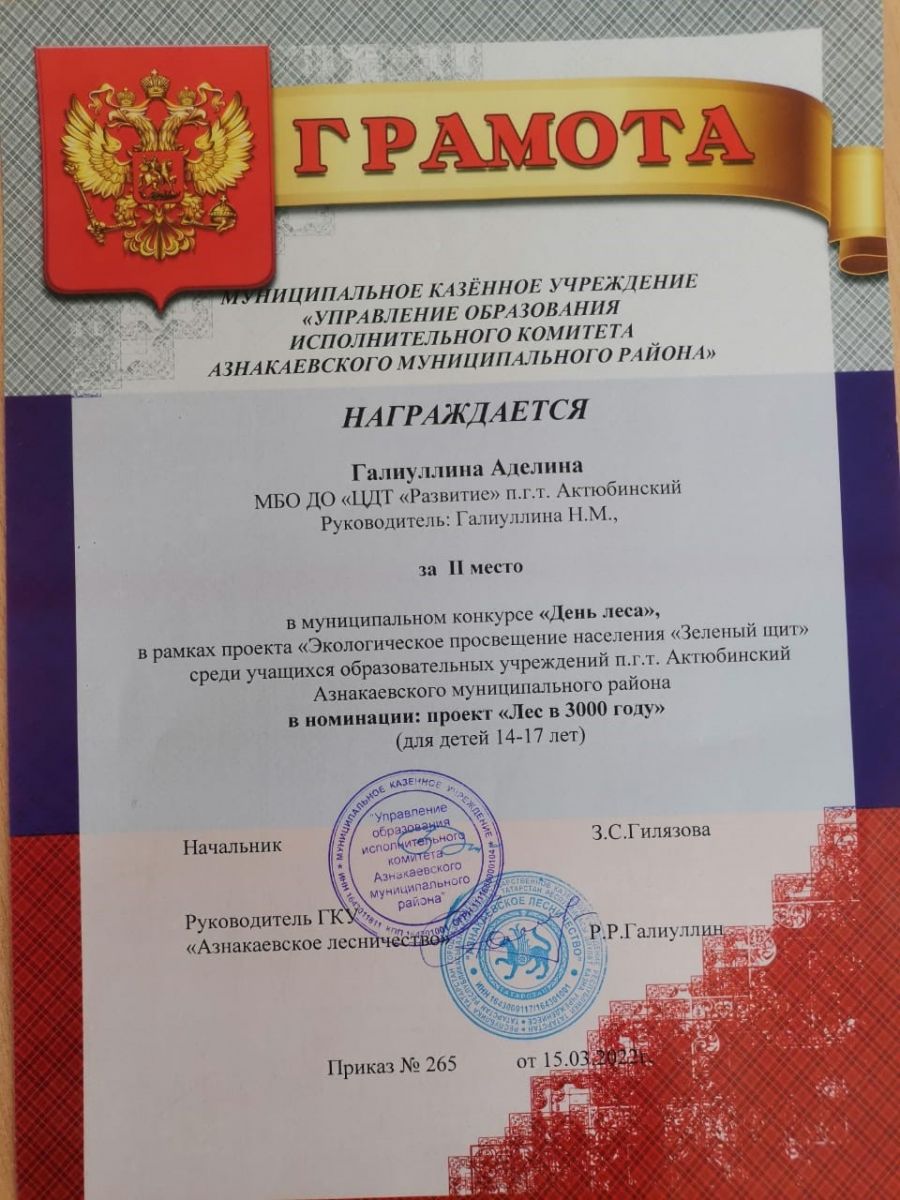 Диплом за 2 место в конкурсе "День леса", участница Галиуллина А., педагог Галиуллина Н.М.