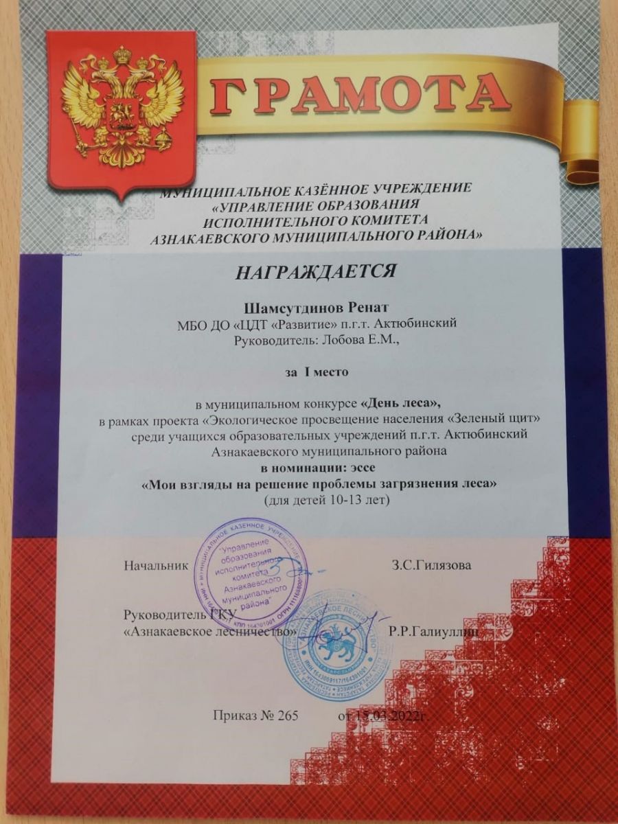 Диплом за 1 место в конкурсе "День леса", участник Шамсутдинова Р, педагог Лобова Е.М.