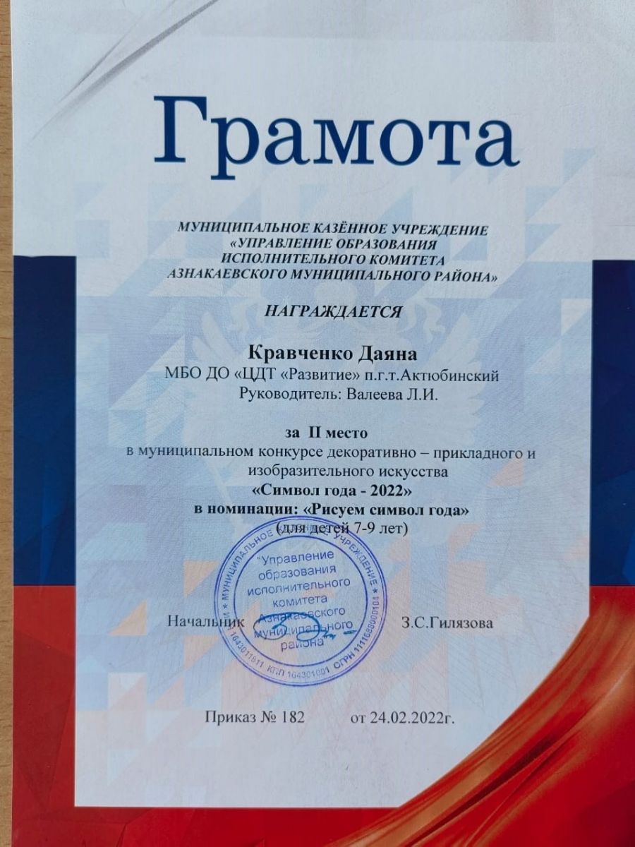 Грамота за 2 место в конкурсе "Символ года - 2022", участница Кравченко Д., педагог Валеева Л.И.
