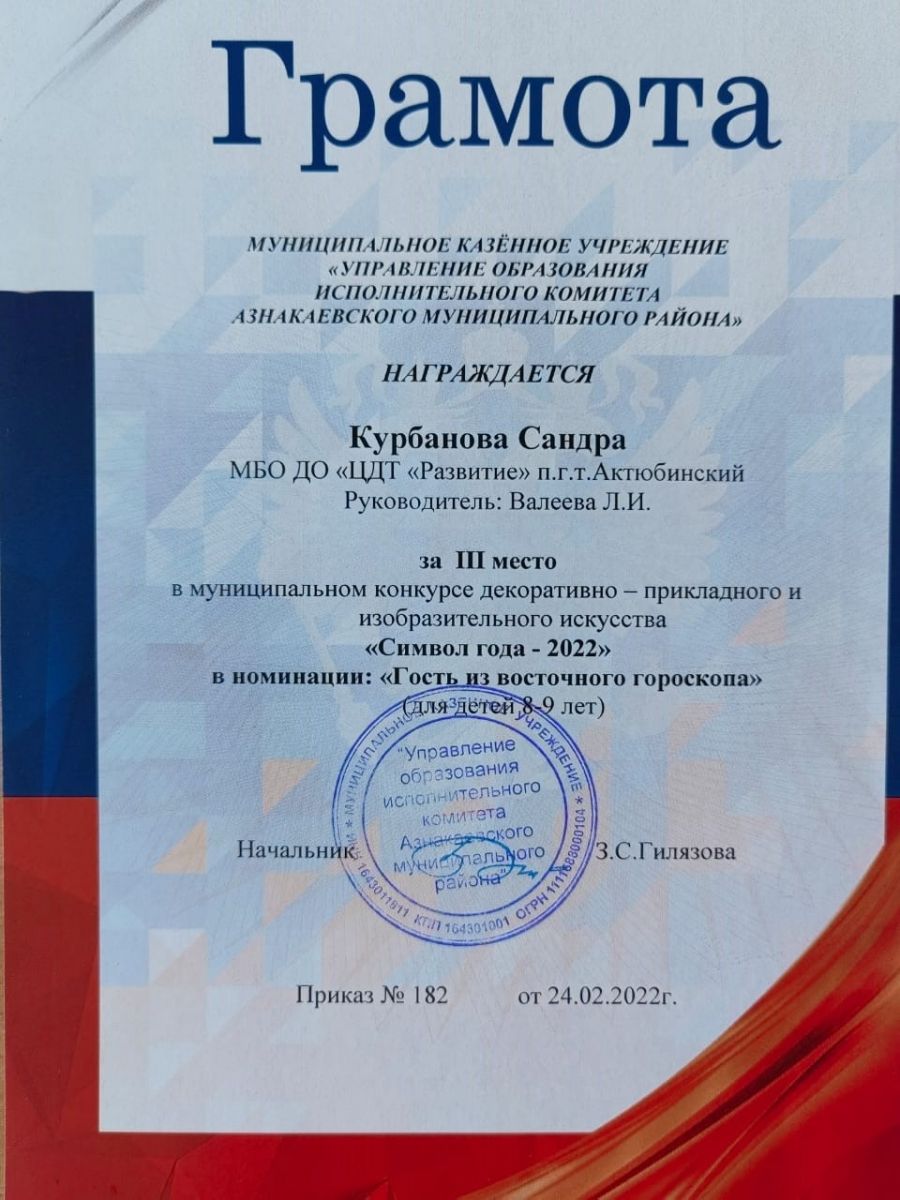 Грамота за 3 место в конкурсе "Символ года - 2022", участница Курбанова С., педагог Валеева Л.И.