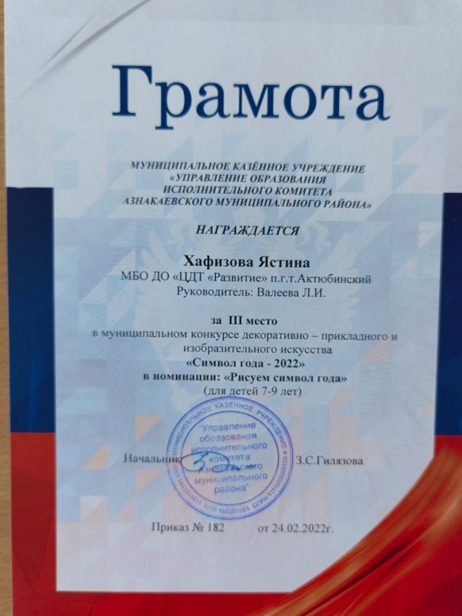 Грамота за 3 место в конкурсе "Символ года - 2022", участница Хафизова Я., педагог Валеева Л.И.