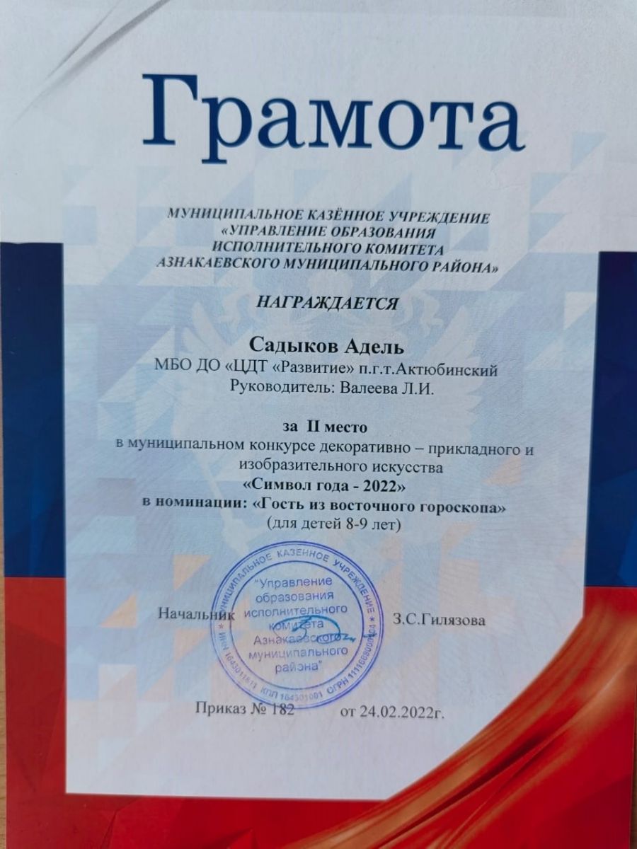 Грамота за 2 место в конкурсе "Символ года - 2022", участница Садыкова А., педагог Валеева Л.И.