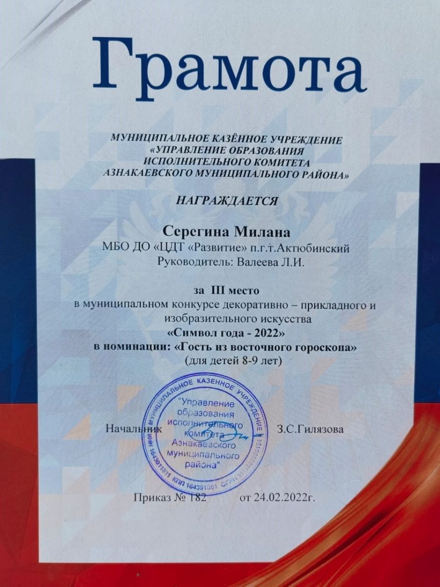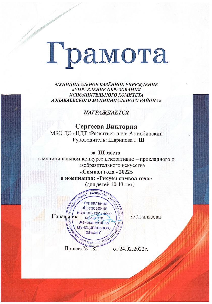 Грамота за 3 место в конкурсе "Символ года - 2022", участница Сергеева В., педагог Шарипова Г.Ш.
