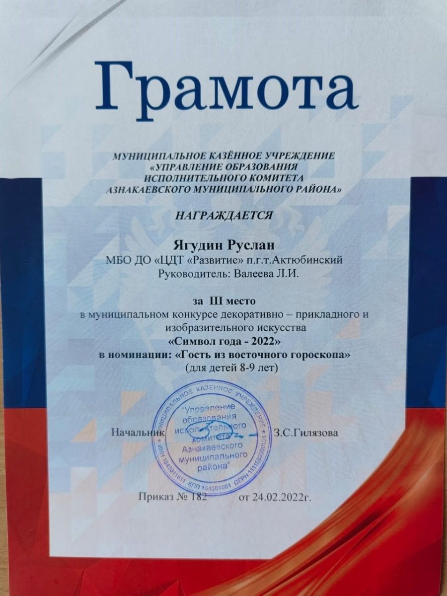 Грамота за 3 место в конкурсе "Символ года - 2022", участник Ягудин Р., педагог Валеева Л.И.