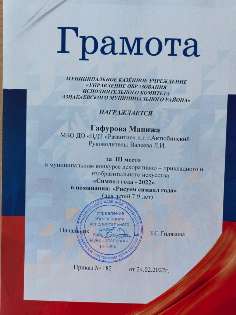 Грамота за 3 место в конкурсе "Символ года - 2022", участница Гафурова М., педагог Валеева Л.И.