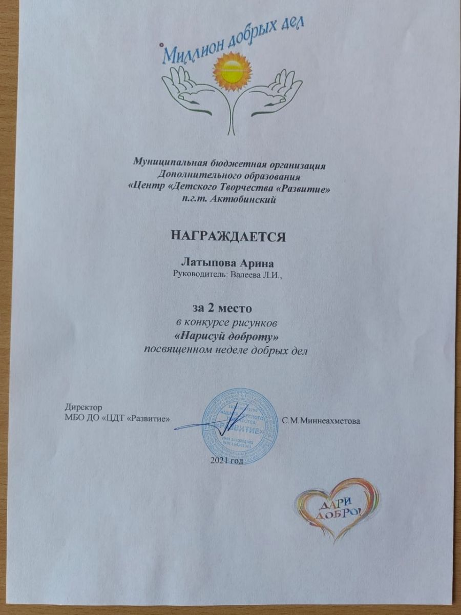 Диплом за 2 место в конкурсе "Нарисуй доброту", участница Латыпова А., педагог Валеева Л.И.