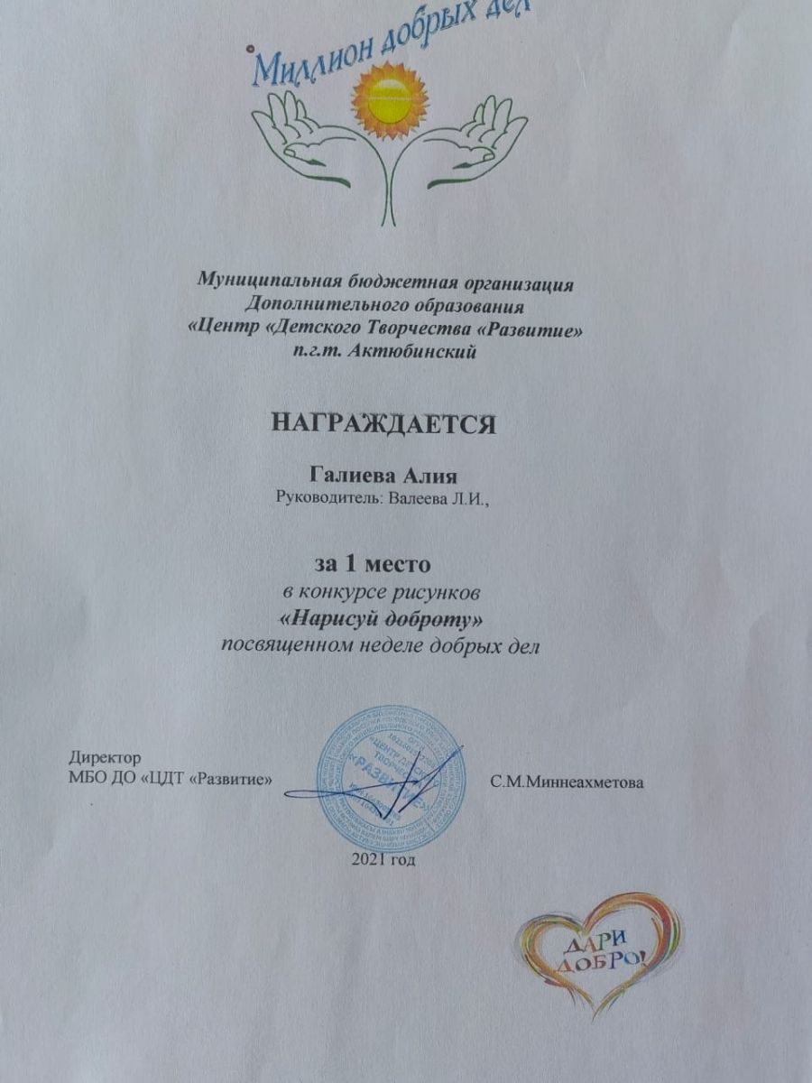 Диплом за 1 место в конкурсе "Нарисуй доброту", участница Галиева А., педагог Валеева Л.И.