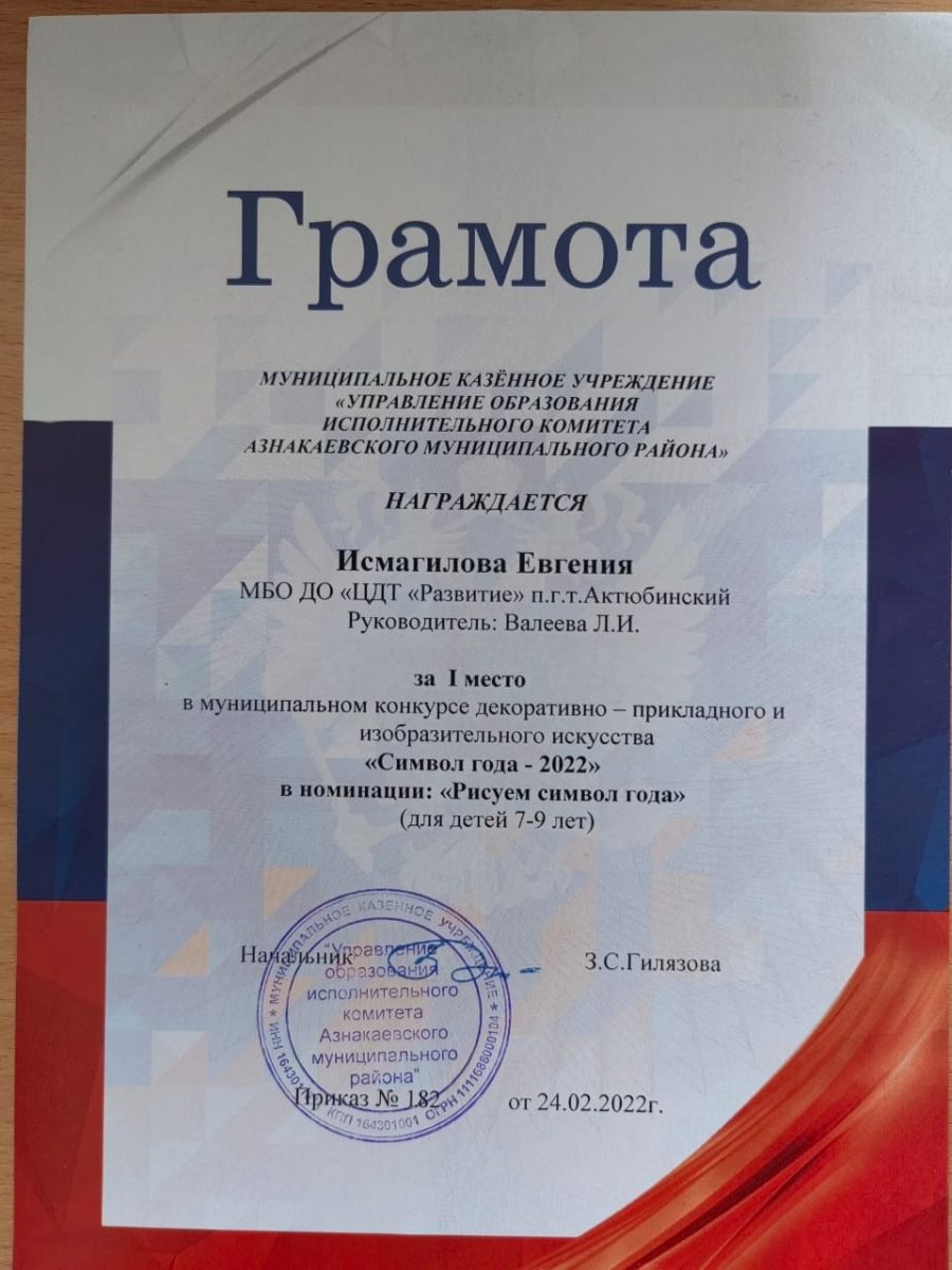 Грамота за 1 место в конкурсе "Символ года - 2022", участница Исмагилова Е., педагог Валеева Л.И.